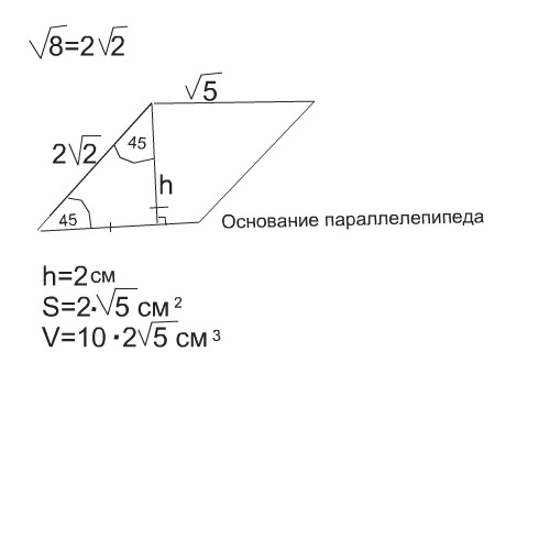 Найти объем прямого параллелепипеда , если его стороны основания под корнем 8 и 5 метров , угол между ним 45 градусов , а длина бокового ребра 10 м