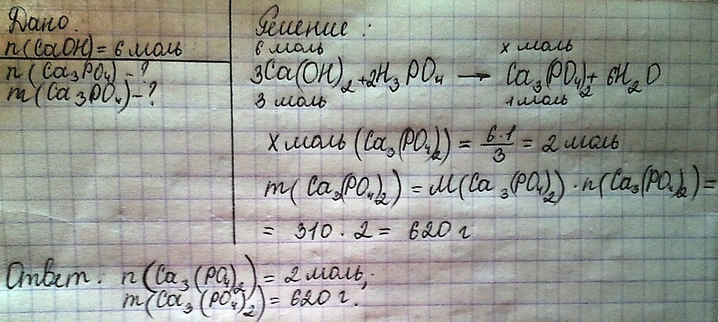 1) По уравнению реакции - n(Ca(OH)2):n(Ca3(PO4)2) = 3:1 => n(Ca3(PO4)2) = n(Ca(OH)2) : 3 = 6 моль : 3 = 2 моль;