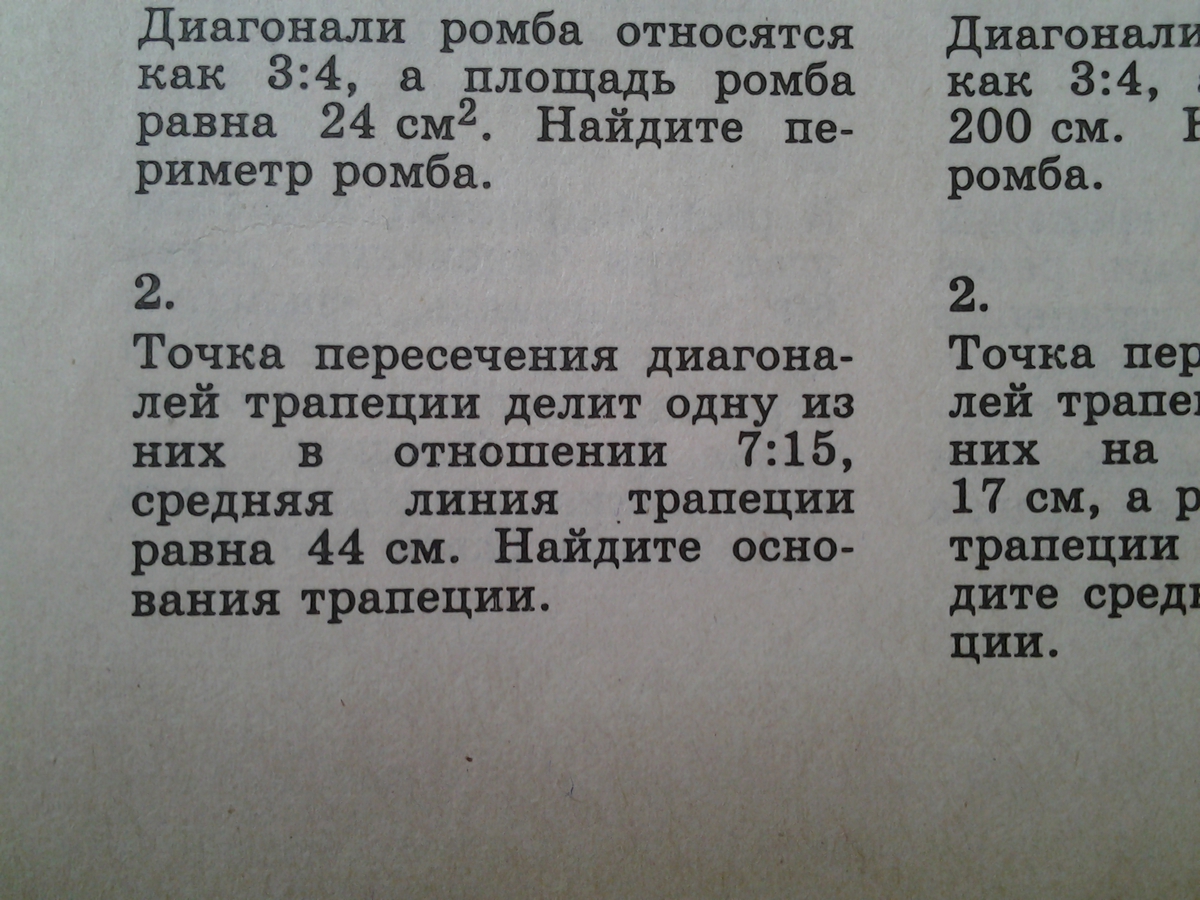 отношение частей диагонали говорит нам о том, что основания трапеции относятся как 7:15 (сделай рисунок и увидишь подобные треугольники) т.к. средняя линия это полусумма оснований - сумма оснований равна 88