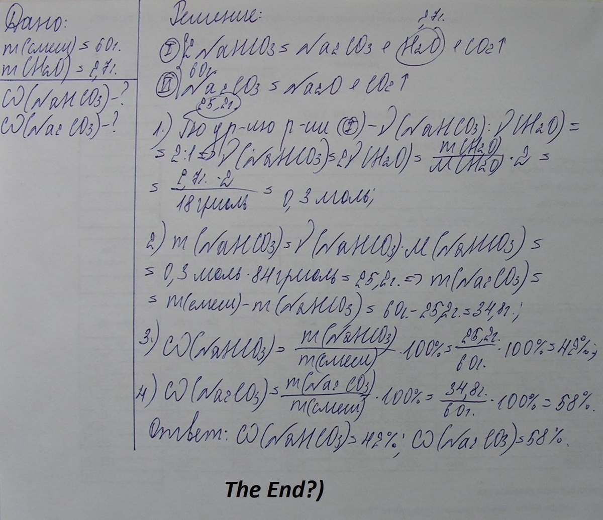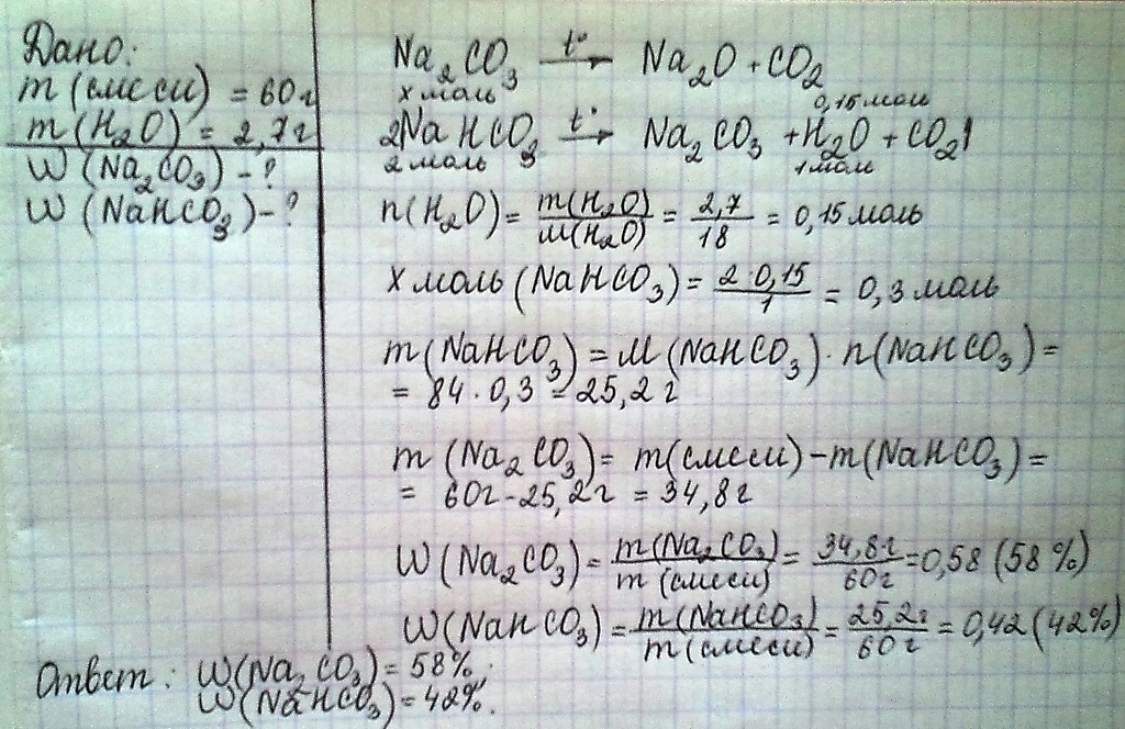 Имеется смесь карбоната натрия и гидрокарбоната натрия. При прокаливании образца смеси массой 60 г выделилась вода массой 2,7 г. Определите массовую долю Na2C03 и NaHC02 в смеси. Ответ: Na2C03 — 58%; NaHC03- 42%