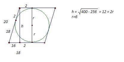 Окружность, вписанная в ромб, точкой касания делит сторону ромба на отрезки, равные 2 и 18. Найти радиус вписанной окружности.