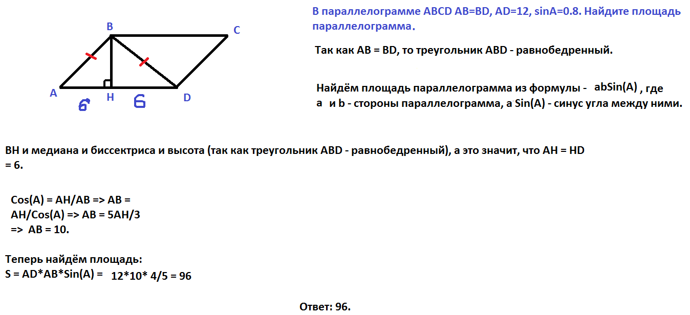 Площадь параллелограмма равна ВК*AD = 8*12 = 96;