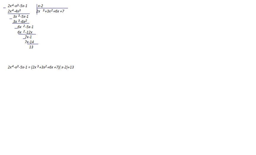 2х4-х³-5х-1/х-2=(2х³+3х²+6х+7)(х-2)+13