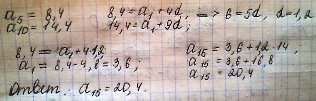 Пятый член арифметической прогрессии равен 8.4, а её десятый член равен 14.4. Найдите пятнадцатый член этой прогрессии.