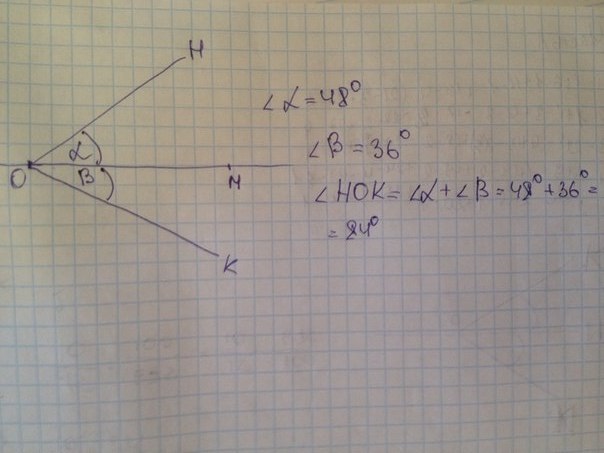 проведите луч ОМ. с помощью транспортира по одну сторону от луча ОМ посторойте угол МОН градусная мера которого равна 48,а по другую сторону угол МОК градусная мера которого 36 чему равна градусная мера угла НОК