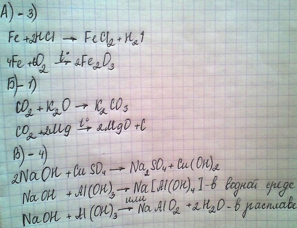 Fe: Поскольку Железо - простое вещество (Металл), то с Магнием(Mg) оно реагировать не будет, также не вытеснит натрий из Сульфата Натрия (Na2SO4), и не будет реагировать с нерастворимым гидроксидом алюминия (Al(OH)3). Но зато, "легко" растворяется в соляной кислоте (HCl) и окисляется кислородом воздуха (O2).