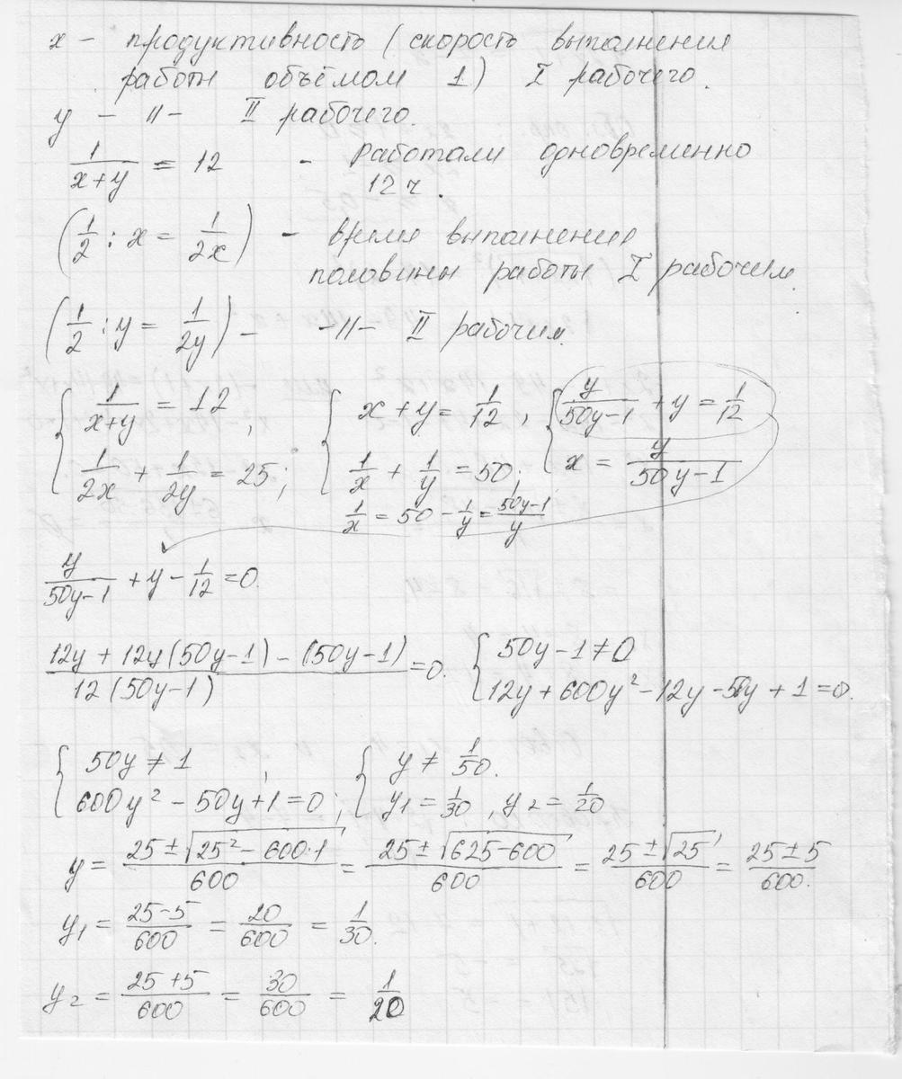 Двое рабочих закончили полученную им работу за 12 ч. Если бы с начало выполнил половину этой работы , а другой оставшуюся , то на выполнение все работы потребовалось 25 ч . За какое время каждый из них закончил бы эту работу ,работая один ?