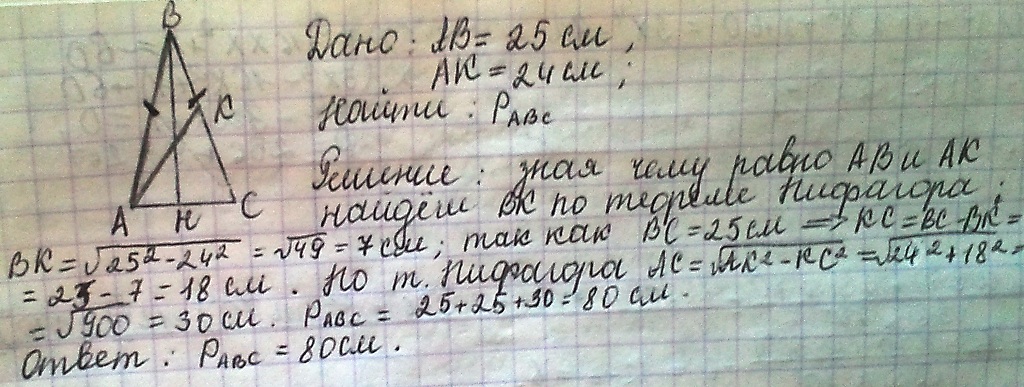 бічна сторона рівнобедреного трикутника дорівнює 25 см,а висота,опущена на неї,-24см.Обчисліть периметр трикутника???