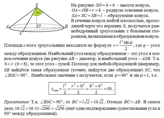 Дан конус с высотой 6 и радиусом основания 8.Найдите наибольшее значение площади сечения его плоскостью,проходящей через вершину конуса.