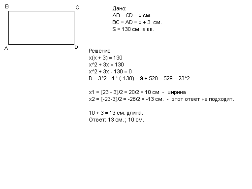 ширина прямоугольника на 3 см меньше его длины. найдите ширину прямоугольника если его площадь равна 130 см в квадрате