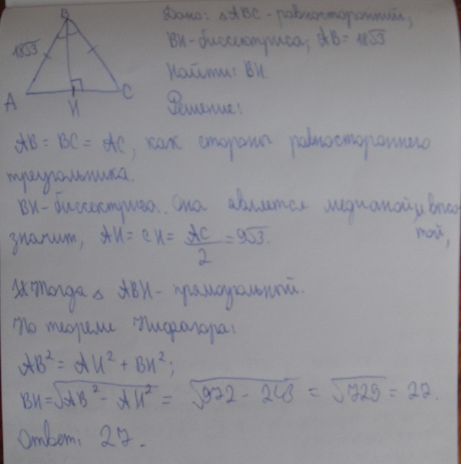 В равностороннем треугольнике биссектриса является одновременно и высотой, и медианой. По теореме Пифагора h = √a²-(a/2)²=(a√3)/2 = 18√3*√3/2 = 27