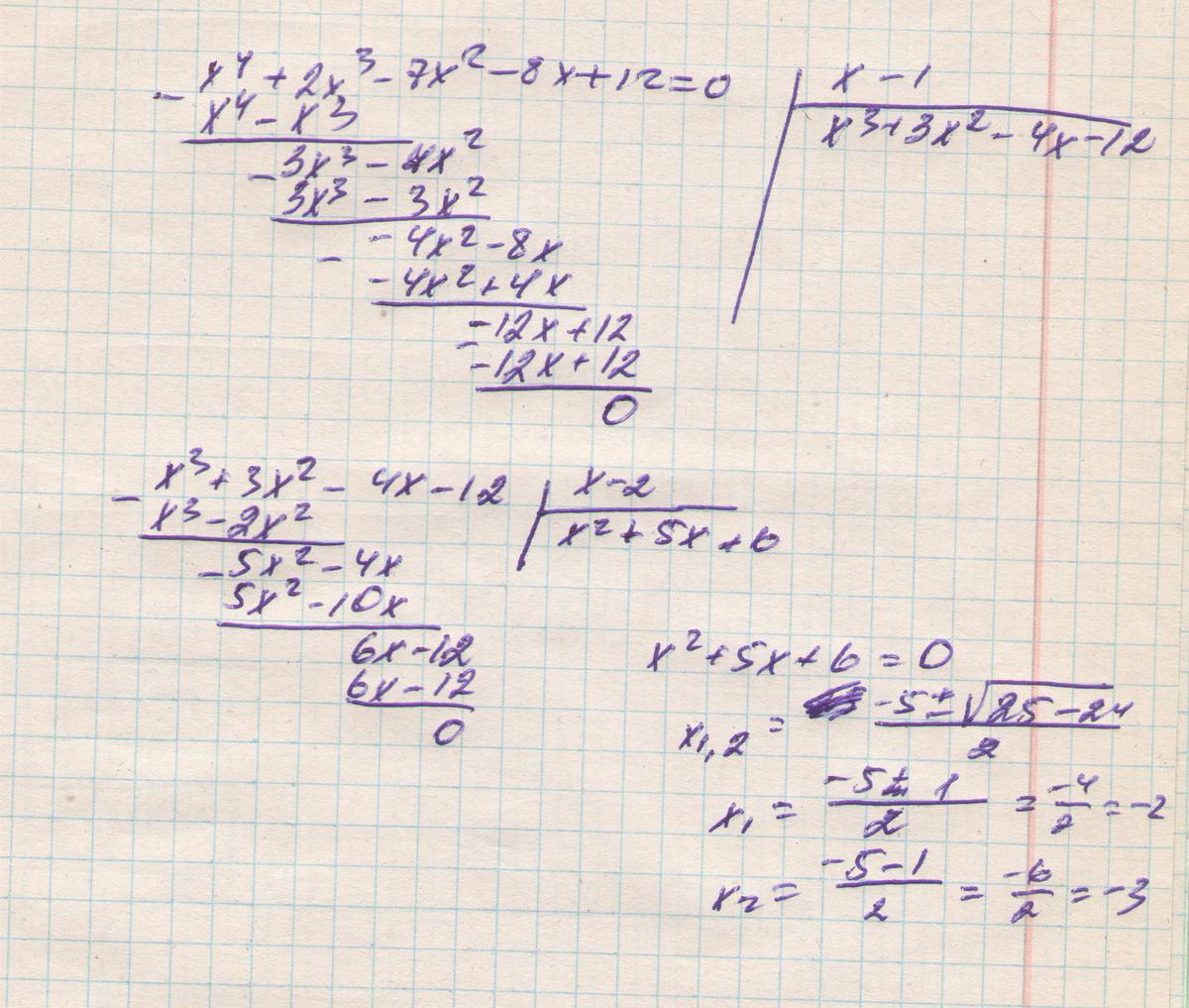 Значит мы можем выражение x^4+2x^3-7x^2-8x+12 поделить на (х-1)