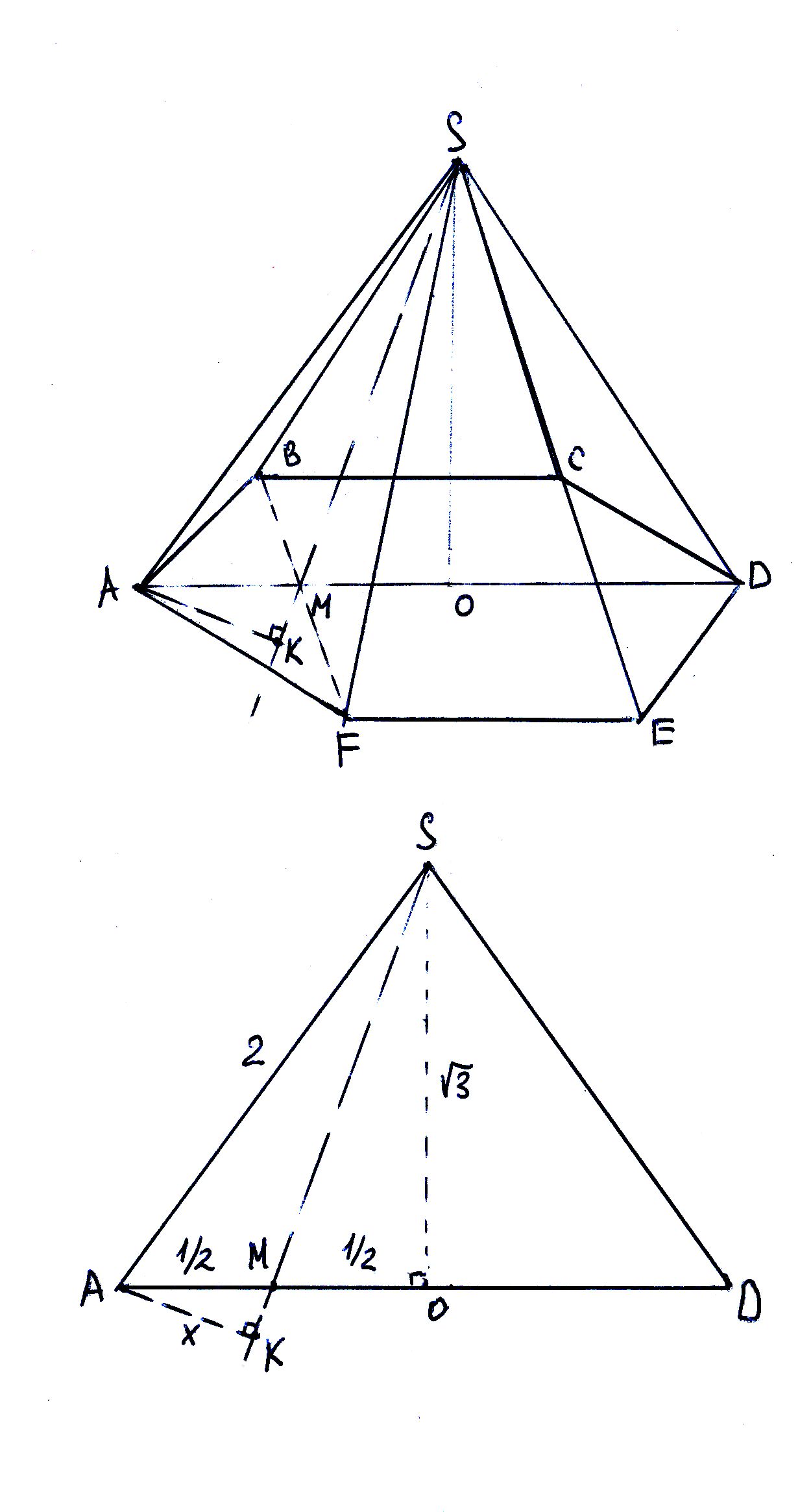 В правильной шестиугольной пирамиде SABCDEF, стороны основания которой равны 1, а боковые ребре равны 2, найдите расстояние от точки А до плоскости SBF.