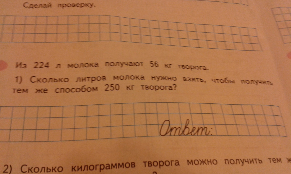 1) 224 : 56 = 4 (л) - молока требуется для получения кг творога