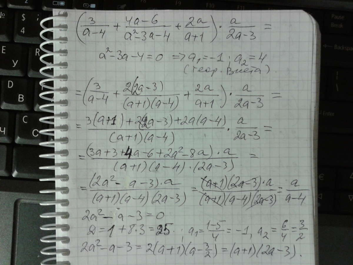(3/(а-4) + (4а-6)/((а+1)(а-4)) + 2а/(а+1)) * а/(2а-3) = (3а+3+4а-6+2а^2-8а)/((а+1)(а-4)) * а/(2а-3) = (2а^2-а-3)/((а+1)(а-4)) * а/(2а-3) = ((а+1)(а-1,5))/((а+1)(а-4)) * а/(2а-3) = ((а-1,5)а)/((2((а-4)(а-1,5)) = а/(2а-8)
