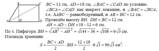 Основи прямокутної трапеції 18 і 12 см, а діагональ є бісектрисою її гострого кута. Обчисліть площу трапеції.