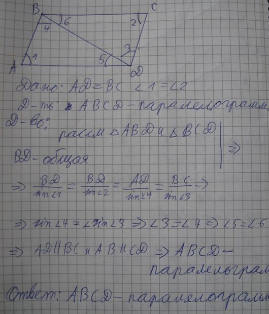 Итак мы доказали, что в четырёхугольнике АВСД противоположные стороны попарно равны: АД = ВС (по условию) АВ = СД (по доказанному). Это является признаком параллелограмма.