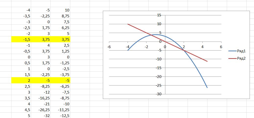Для проверки можно решить и аналитически, приравняв 4-(x+1)^2 = -2,5x