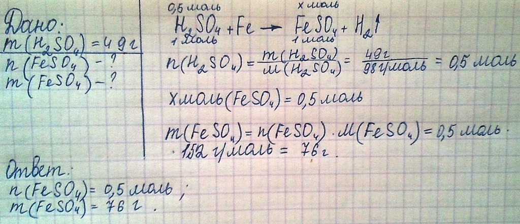 Рассчитайте количество и массу соли, образовавшейся в результате взаимодействия 49 г.сульфатнои кислоты с железом