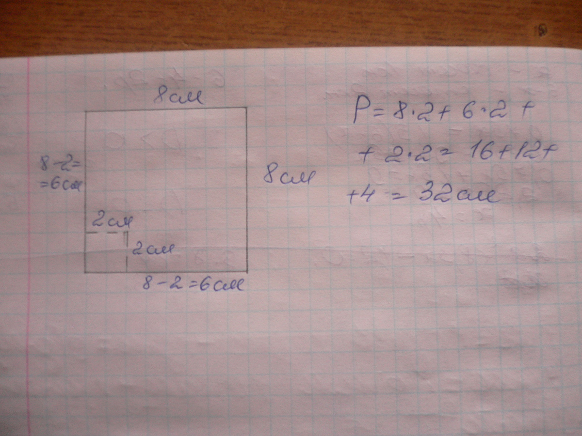 От квадрата со стороной 8 см отрезали с помощью двух разрезов квадрат со стороной 2 см. Чему равен периметр оставшейся фигуры?