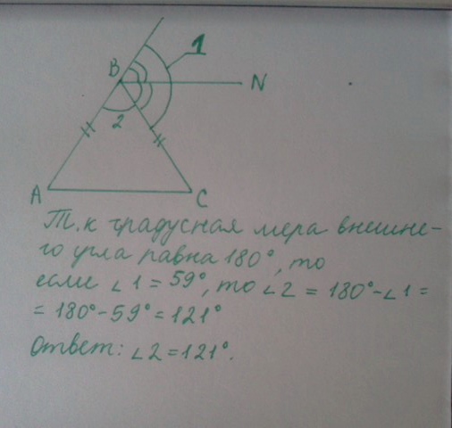 в равнобедренном треугольнике ABC с основанием AC проведена биссектриса BN внешнего угла при вершине B(там 1 угол) .Определите угол 2 если угол 1 = 59