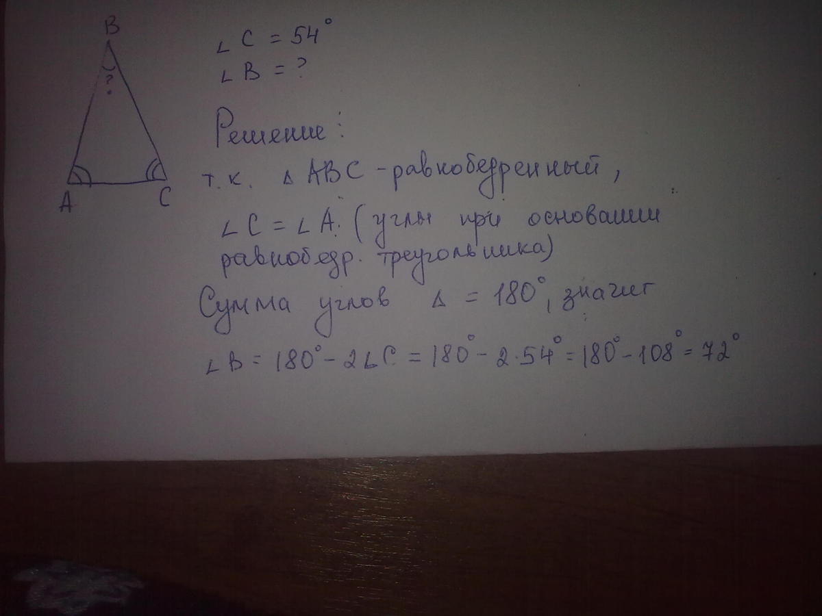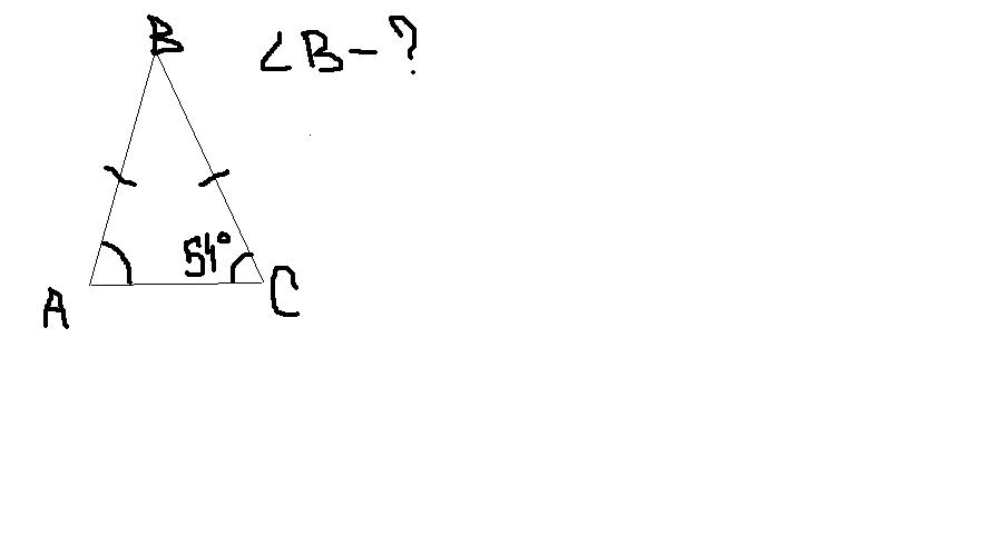 Если треугольник равнобедренный, то углы при основании равны то есть угол B = углу A.