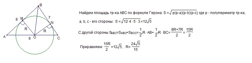 центр окружности находится на стороне АС треугольника АВС и окружность прикасается со стороной АВ,ВС. АВ=8см,ВС=7см,АС=9см,найдите радиус окружности. за ранее спасибо