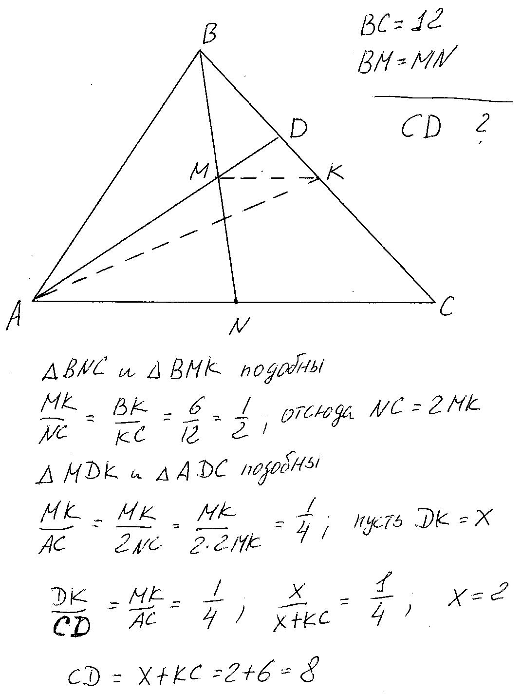 Проведём из вершины А медиану к ВС. Тогда МК-средняя линия(ВМ=МN, ВК=КС). Далее из подобия треугольников (смотри рисунок) находим СD=8.