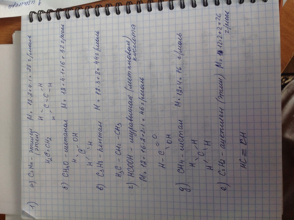 1).Выпишите формулы и вычислите молярные массы непредельных углеводородов: C2H4, CH4O, C3H8, HCOOH, CH4, C2H2. Дайте им названия, составьте структурные форумлы.