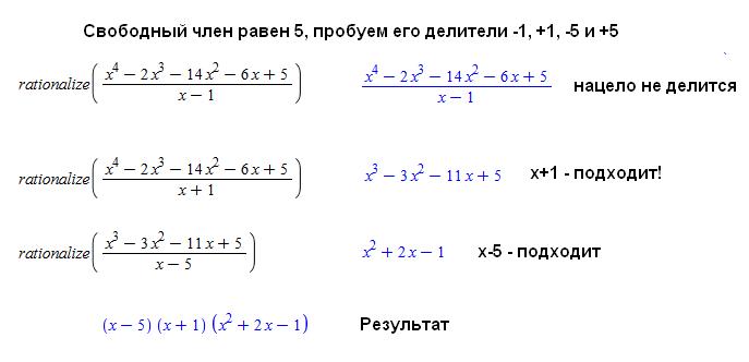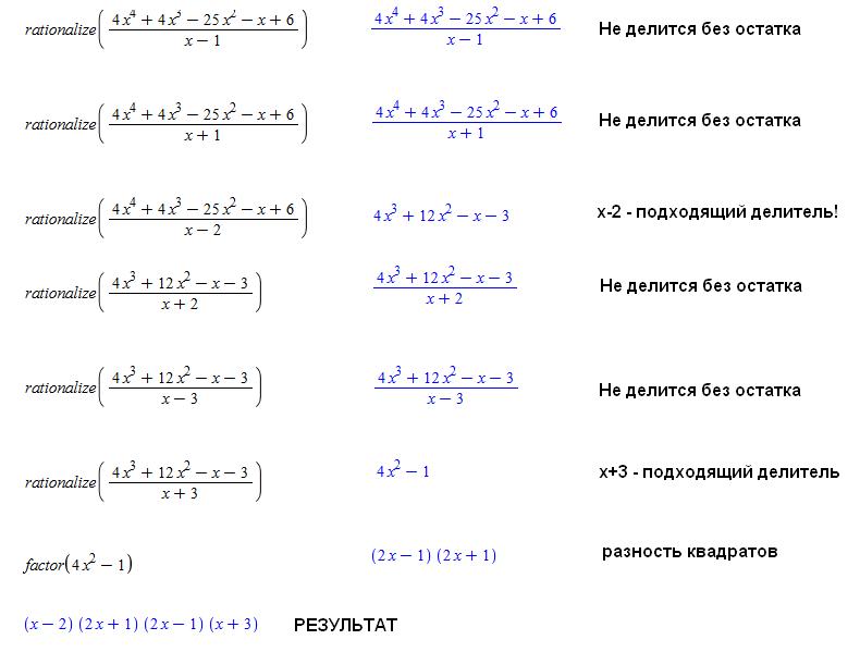 Решено методом подбора. При разложении полинома используем его свойство иметь целочисленные корни, являющиеся делителями свободного члена.