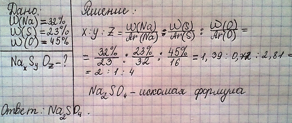 Выведите формулу соединения Na(x)S(y)O(z), если известно процентное содержание элементов: w(Na)=32%, w(S)=23%, w(O)=45%.