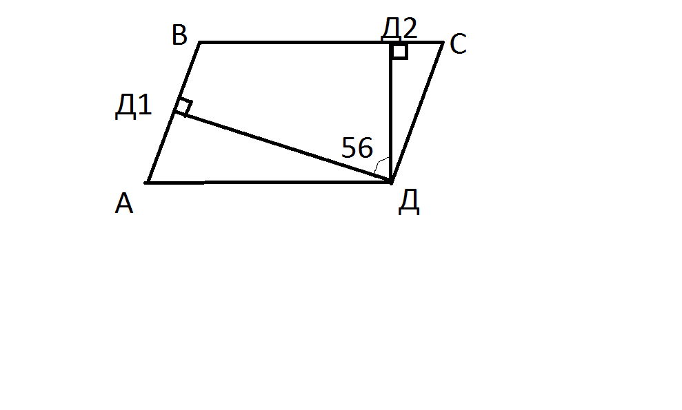 1. Параллелограмм ABCD ,ДД1и ДД2- перпендикуляры к прямым АВ и ВС . ДД1 перпендикулярен АВ, ДД2 перпендикулярен ВС, Угол ВД1Д=углу ВД2Д=90 градусов , угол Д1ДД2=56.Имеем четырехугольник ВД1ДД2