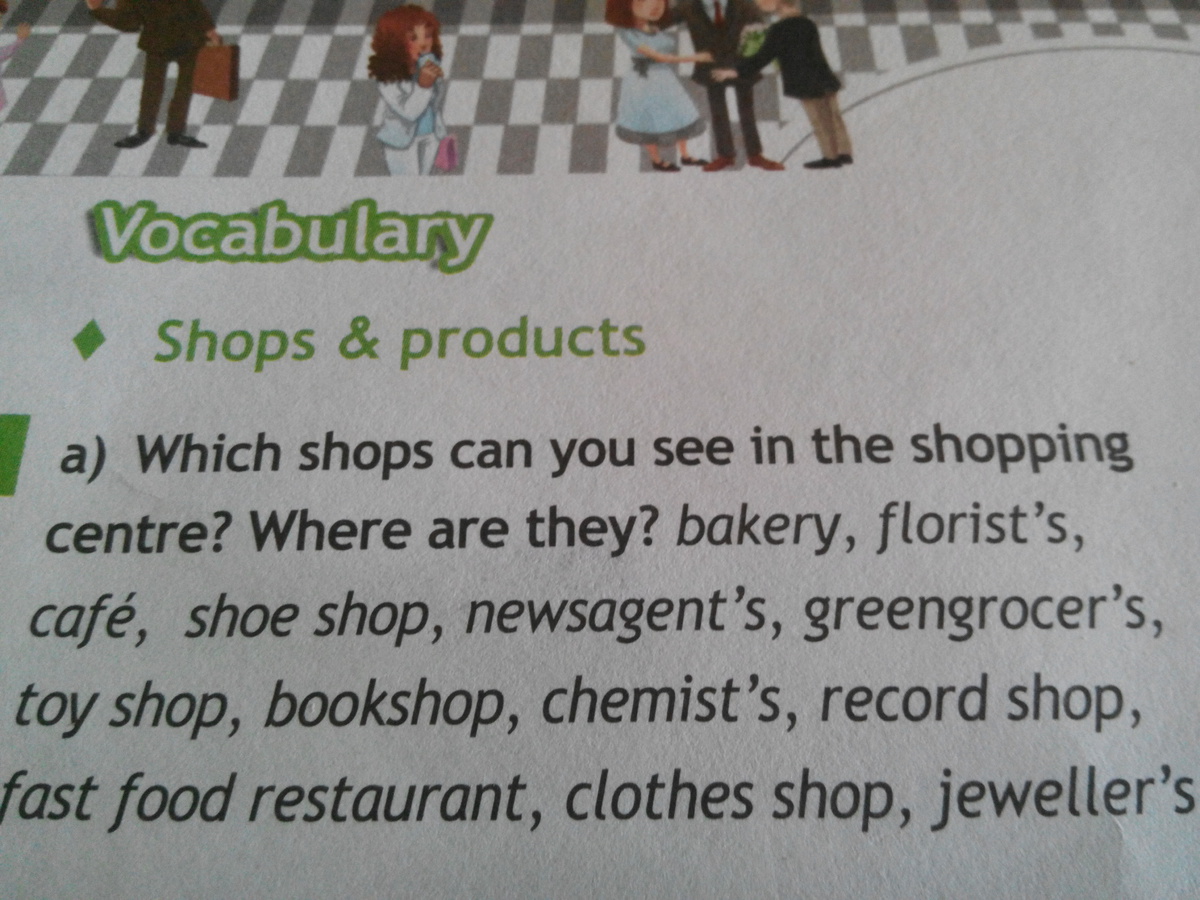 Пекарня, цветочный магазин, кафе, обувной магазин, газетный киоск, зеленая лавка, магазин игрушек, книжный магазин, аптека, музыкальный магазин, ресторан быстрой еды, магазин одежды, ювелирный магазин