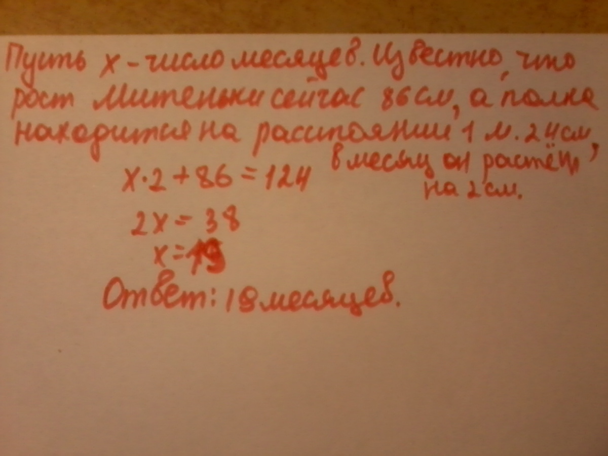 Рост Митеньки сейчас 86 см. Сколько месяцев ему потребуется, чтоб до тянуться до верхней полки шкафа, на которой стоит клубничное варение,если полка находится на расстоянии 1 м 24 см и он подрастает в месяц на 2 см