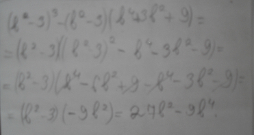 (b^2-3)^3-(b^2-3)(b^4+3b^2+9)=(b^2-3)^3-(b^6-27)=b^6-9b^4+27b^2-27-b^6+27=27b^2-9b^4=9b^2(3-b^2)