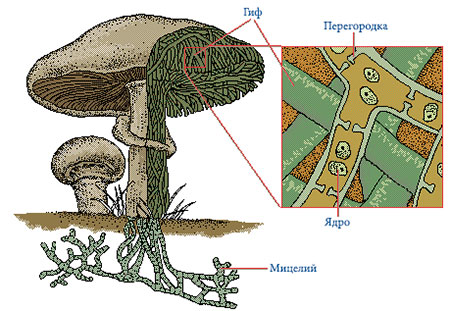Особенностью строения большинства грибов является то, что они состоят из мицелия и вегетативных (плодовых) тел. Мицелий практически полностью или большей своей частью погружен в субстрат. Он проникает в почву, древесину, лесную подстилку, органы растений-хозяев, т.д. Поглощение питательных веществ происходит всей поверхностью мицелия или посредством особых приспособлений, как у многих паразитических видов. Споры, за редким исключением, формируются на поверхности субстрата – на воздушном мицелии либо на плодовых телах, что важно для их распространения.Мицелий обычно образуется из споры, иногда из кусочков мицелия или других элементов гриба. При прорастании спора формирует ростковую трубку, которая постепенно становится длиннее, а затем начинает ветвиться. Растет мицелий всегда верхушкой вперед, а ветвится по всем направлениям.По внешнему виду мицелий разных видов грибов сходен, но в его строении имеются существенные отличия. У более примитивных видов мицелий неклеточный. Он представляет собой как будто одну клетку гигантских размеров с большим количеством ядер. Такой мицелий характерен для многих водных форм и некоторых наземных грибов (мукор, ризопус). У высших грибов мицелий делится перегородками на клетки, в каждой из которых содержится от одного до нескольких ядер.У ряда видов грибов, например, дрожжевых, мицелия нет, а их вегетативное тело выглядит как одиночные почкующиеся или делящиеся клетки. Доказано, что такая разновидность вегетативного тела представляет собой эволюционную адаптацию к обитанию в определенных условиях, например, в жидкостях с большим содержанием сахаров.В исследованиях ученых было доказано, что в ходе эволюции мицелий появился не сразу. У самых примитивных из ныне существующих грибов имеется вегетативное тело в форме голого протопласта без клеточной оболочки, развивающееся внутри клетки хозяина. Позднее вследствие эволюционных преобразований увеличение размеров тела грибов пошло по пути формирования нитчатых (мицелиальных) видов. При этом поверхность и объем тела гриба увеличиваются одновременно, поэтому становится возможным практически неограниченный его рост и эффективное использование субстрата организмом.На основе мицелия у разных видов грибов появились множественные адаптации, связанные с условиями обитания. Это образование разных видоизменений мицелия и таких сложных элементов, как плодовые тела, которые могут достигать крупных размеров и иметь сложное строение.У макромицетов чаще всего встречаются такие видоизменения мицелия, как ризоморфы и мицелиальные тяжи, которые состоят из пучков гиф, пронизывающих субстрат и достигаючих в длину нескольких метров. Крупные, хорошо развитые мицелиальные тяжи называют ризоморфами. Они выглядят как шнуры темной окраски.Еще одна разновидность видоизмененного мицелия – склероции. Это уплотненные переплетения мицелия, предназначенные для перенесения неблагоприятных условий среды. Их формируют многие грибы для хранения запасов питательных веществ, например, для зимовки.
