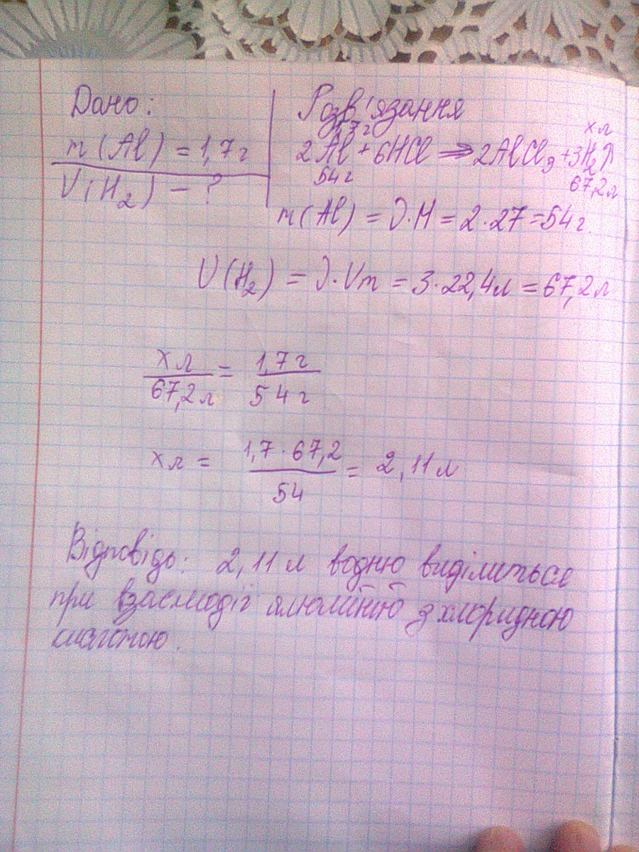 щоб знайти масу алюмінію...треба V(ню) помножити на молярну масу(M), вийде 54 г..а щоб знайти об'єм водню треба V(ню) помножити на Vm, вийде 67,2 л.