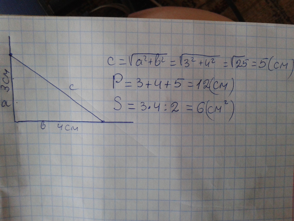 построй прямой угол. отложи на его сторонах от вершины отрезки длиной 3см и 4см. соедини полученные точки отрезком. найди периметр и площадь полученного треугольника.