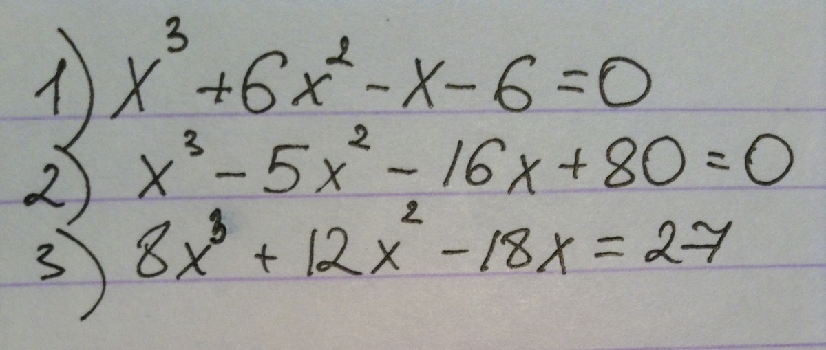1)(x³-x)+(6x²-6)=x(x²-1)+6(x²-1)=(x+6)(x²-1); (x+6)(x-1)(x+1)=0; x₁=-6; x₂=1; x₃=-1. ОТВЕТ: -6;-1;1. Думаю принцип поняла, дальше сама попробуй) Лень мешает разуму)