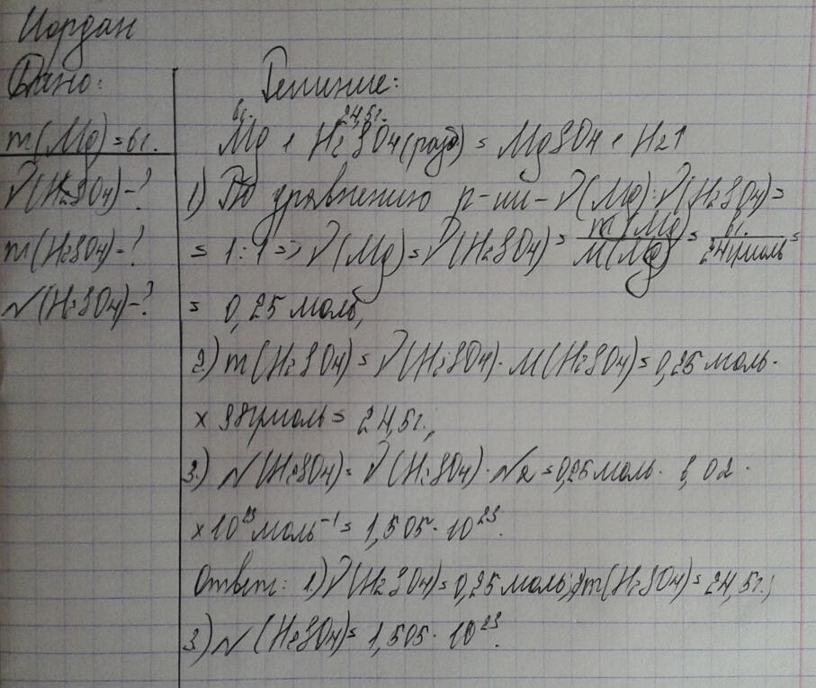вычислите количество вещества, массу и число молекул серной кислоты,вступившей в реакцию с 6г магния.