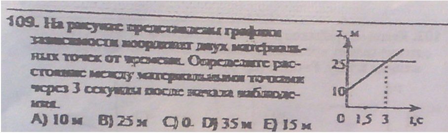 На рисунке представлены графики зависимости координат двух материальных точек от времени. Определите расстояние между материальными точками через 3 секунды после начала наблюдения.