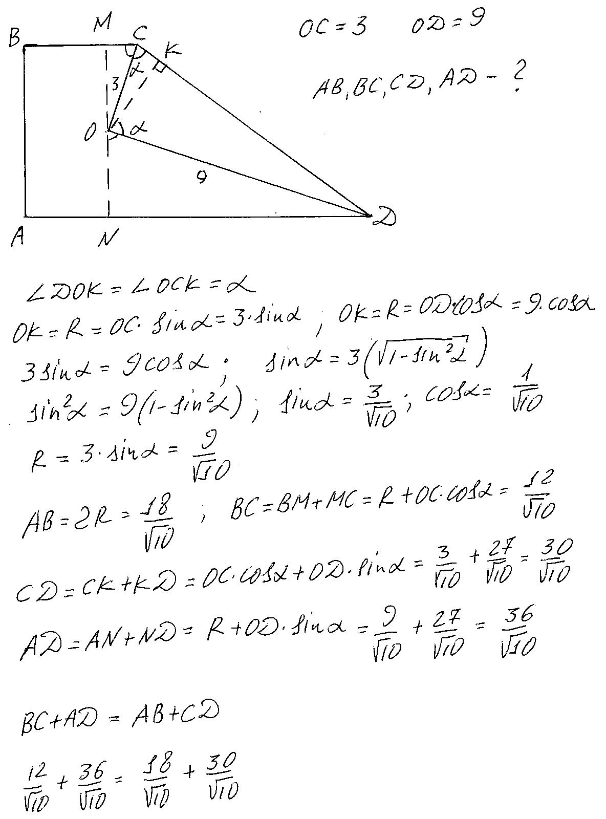 Центр окружности вписанной в прямоугольную трапецию удален от концов ее боковой стороны на расстояния 3 и 9 см.найти стороны трапеции