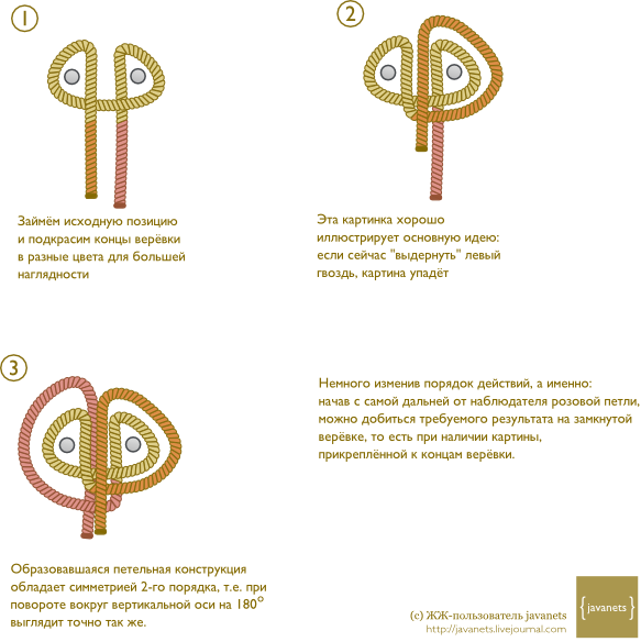 помогите решить задачу : Дедушка Федот привязал к картине длинную. верёвку, вбил в стену два гвоздя и повесил на них так что если выдернуть хотя один из гвоздей то картина упадёт. ВНИМАНИЕ ВОПРОС: Как он это сделал???