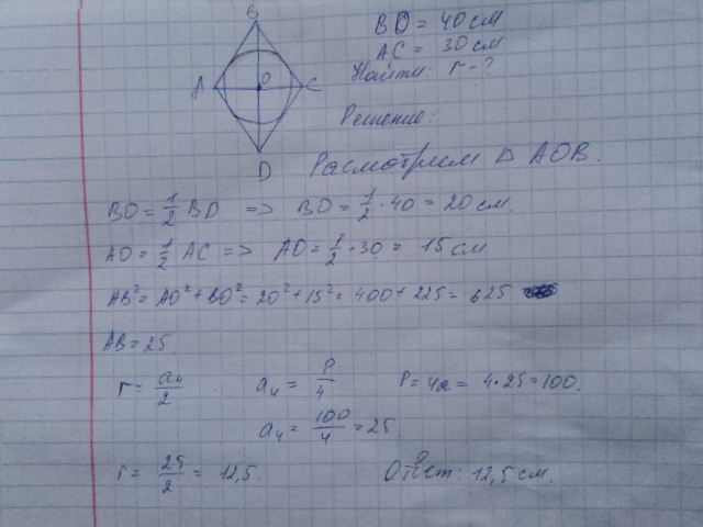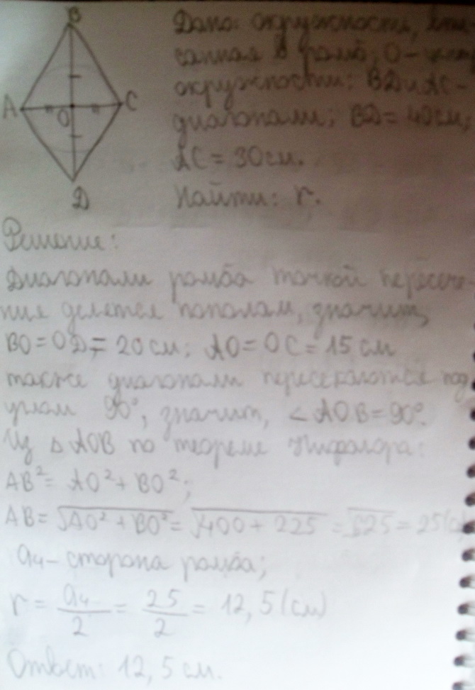 Диагонали ромба равны 30 см и 40 см. Найдите радиус окружности, вписанной в ромб.(пожалуста решите с рисунком)