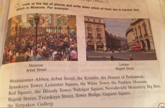 Westminster Abbey, the Houses of Parliament, Leicester Square, the White Tower, the Bloody Tower, Trafalgar Square, Big Ben, Regent Street, Tower Bridge.