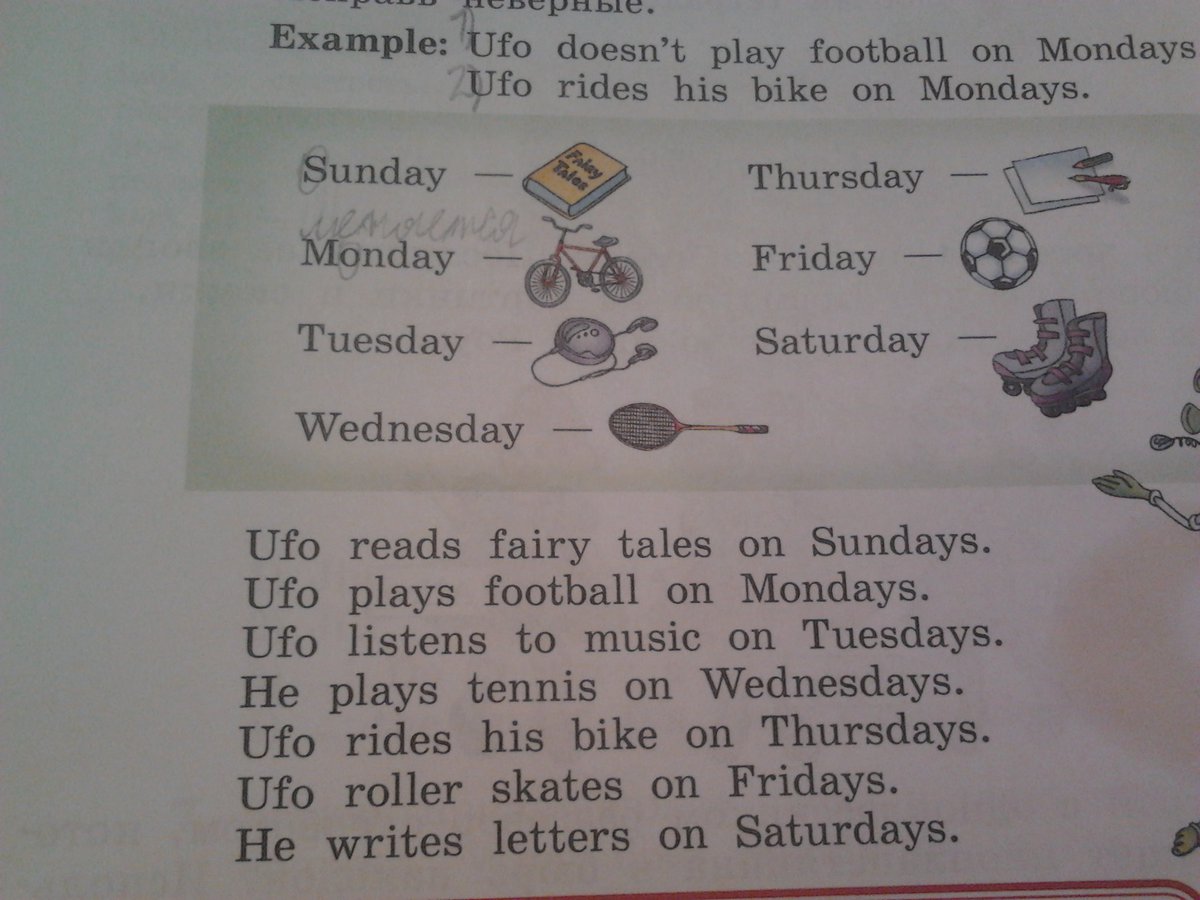 Помогите исправить неверные предложения. 1. Ufo reads fairy tales on Sunday. 2. Ufo plays football on Monday. 3.Ufo listens to music on Tuesday.