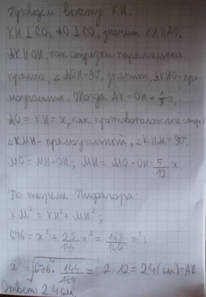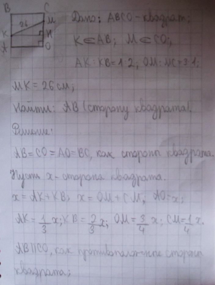 на стороні Ав квадрата АВСО позначено точку К, а на стороні СО-точку М так,що АК:КВ=1:2,ОМ:МС=3:1.Знайдіть сторону квадрата ,якщо МК=26 см.