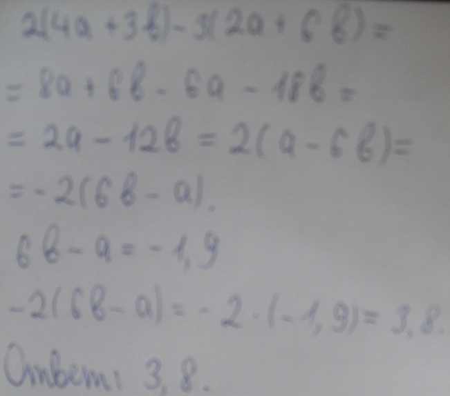 2(4a+3b)-3(2a+6b)= 8a + 6b - 6a - 18b = 2a - 12b = -2(6b-a)= (-2)*(-1,9) = 3,8