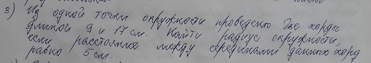 Соединим концы хорд а=9см и b=17см и получим треугольник. Третья сторона треугольника в два раза больше средней линии с = 5*2 = 10cм.
