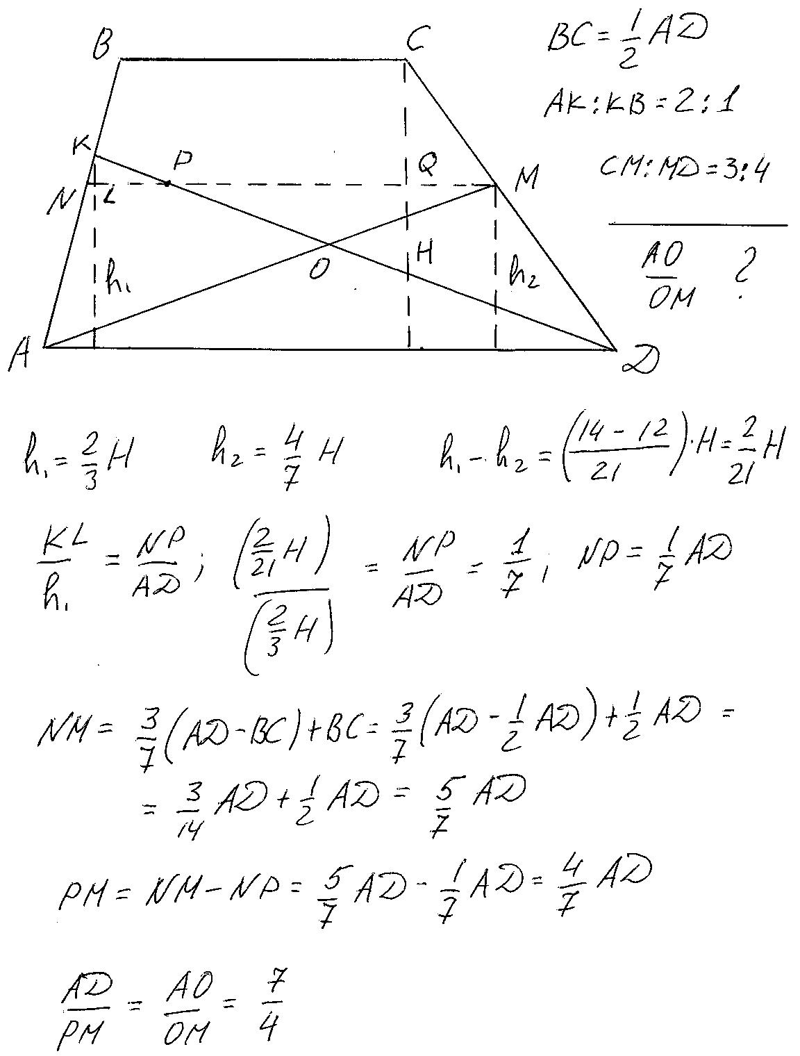 Из точек К, С,М проведём высоты, соответственно h1,H.h2.Проведём NM параллельно АД. Затем из подобия треугольников и заданных соотношений отрезков боковых сторон, найдём маленькую высоту KL треугольника NKР.(смотри рисунок). Далее из подобия треугольников NKP и АКД находим величину NP=1/7АД. Затем находим NM(теорема Фаллеса и подобие треугольников) и PM. Далее из подобия треугольников POM и АОД окончательно находим АО/АМ=7/4.